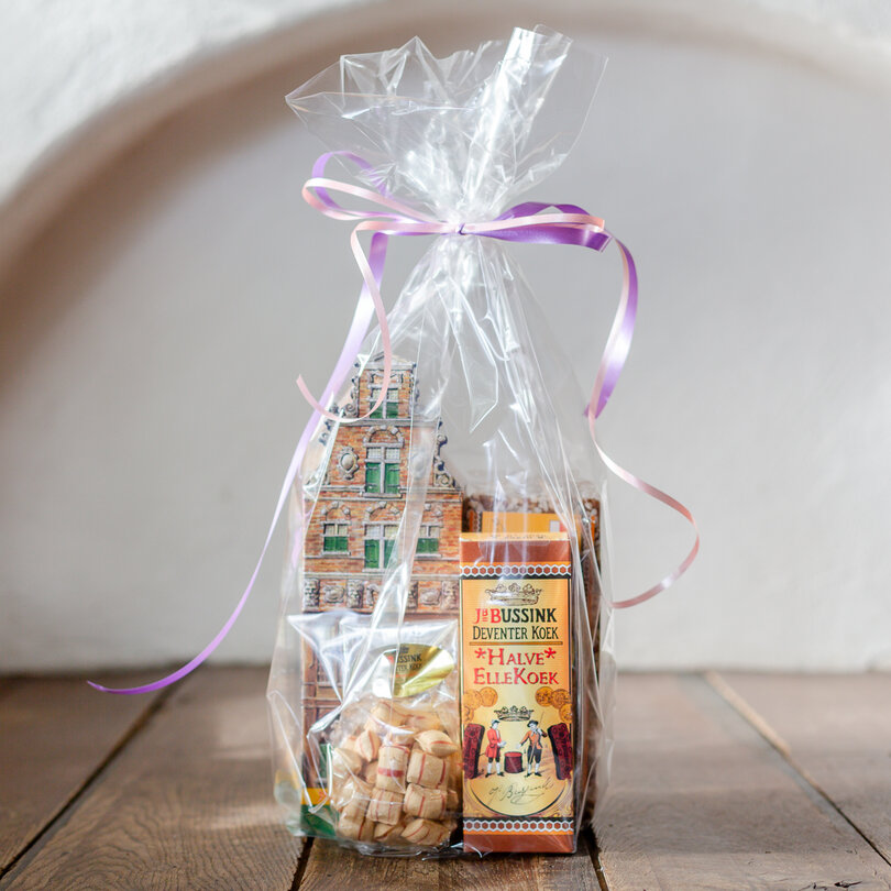 Deventer Koek in kleine hapklare koekjes of een stevige plak. Dit pakket biedt u beide. Het oud-hollands snoepgoed maakt het geheel compleet.
