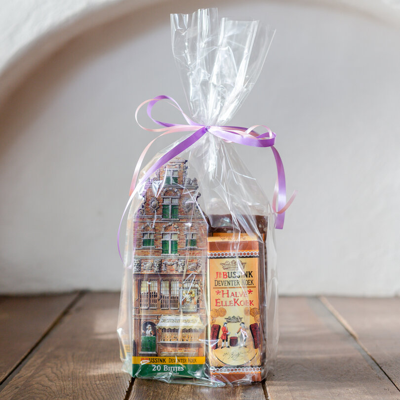 Twee soorten originele Deventer Koek, in handzame blokjes en in een oudhollandse maat, de halve elle. Een leuke geste voor een feestelijke gelegenheid.